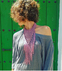Collar realizado con la técnica de crochet, en ida y vuelta. Una vez finalizado, coloca flecos alrededor y cose a ambos extremos una cinta para atar en el cuello.
