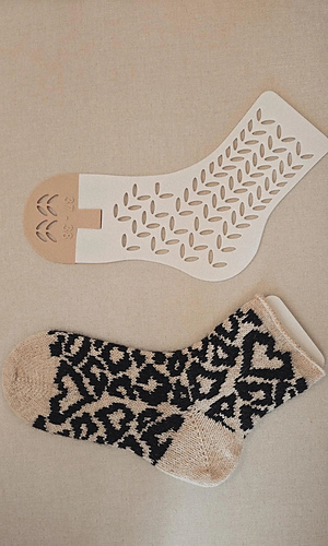 Este proyecto destaca por su estructura técnica y su lenguaje visual. Las medias presentan un gráfico en colorwork que se extiende desde la puntera hasta el final, con una interrupción estratégica para la construcción del talón, logrando un ajuste anatómico y estético superior.