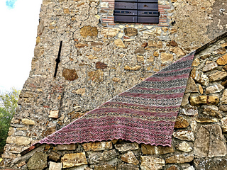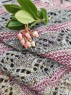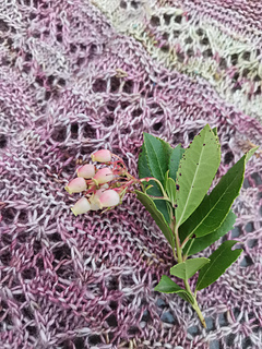 In this region, there’s a smallish tree that can be seen in gardens and in the woods as well. It grows edible fruits, that are small, round and look a bit spiny, but are soft without a hard peel. The yellow fruits turn red when they mature, and they are hardly bigger than my fingertips. The fruits mature in November - December. The particularity of this tree is that while the fruits mature, the branches are also full of delicate, almost white, tiny bell-shaped flowers. The tree is called corbezzolo. This shawl takes its colors and lace pattern from these little hanging flowers.