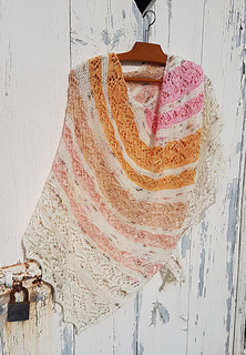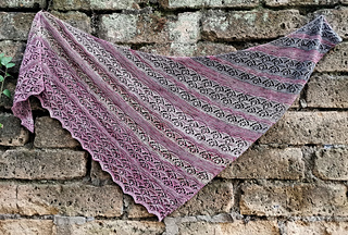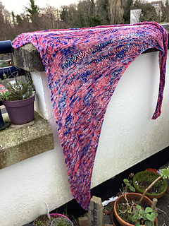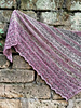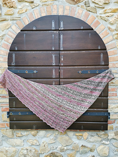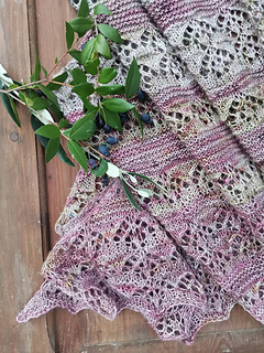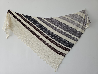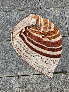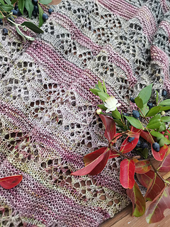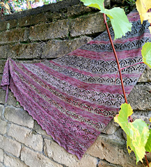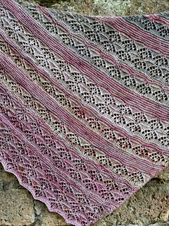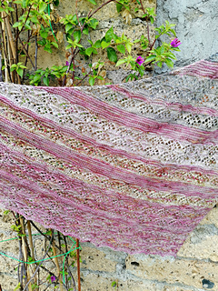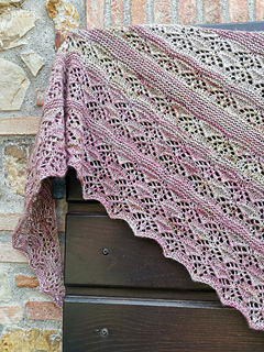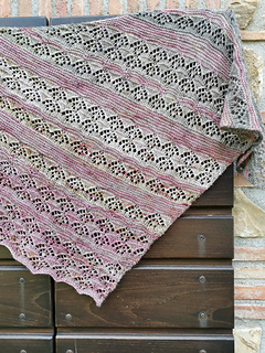 Corbezzolo is a triangular shawl knit from one tip down alternating lace panels and garter st sections.