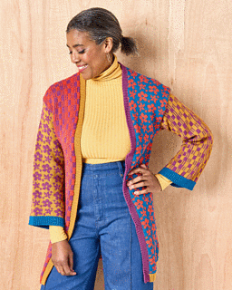The right front and right back pieces of this cardigan feature a colourwork grid pattern, while the left front and back are decorated with daisy motifs - the same patterns are worked on the sleeves, but in different colour pairings. Different shades are used for the front bands, hems and cuffs, too. Chloé Elizabeth Birch’s design is knitted in Debbie Bliss’s gorgeously soft Baby Cashmerino yarn.