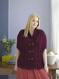 Sizes S-L, 1X-2X. This buttoned cape features a classic cabled design. (Lion Brand Yarn)