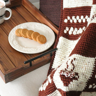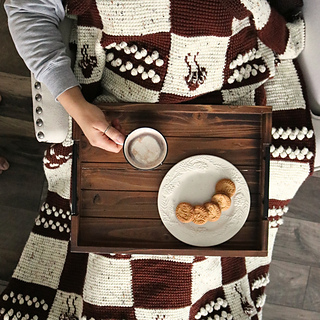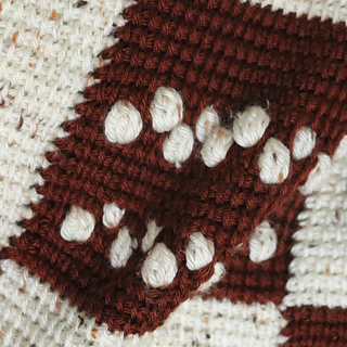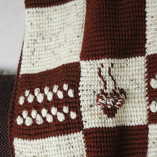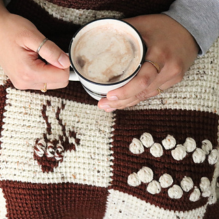 This pattern is for a winter cozy cocoa square themed colorwork Tunisian crochet lapghan that is worked bottom-up in panels using the join-as-you-go method. The bobble stitches add texture and are inspired by cozy vibes that come from fluffy marshmallows in a cup of hot cocoa on a cold winter morning.