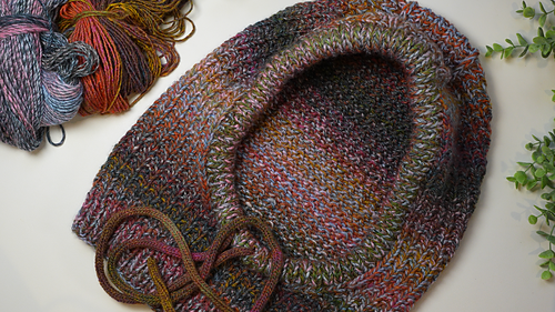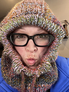 Worked in the round with shaping to create a fitted hood and extended neck coverage.