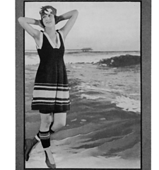 This bathing suit is made in two pieces of double crochet throughout with single crochet contrast bands at the neck. There are decorative buttons on the shoulders.
