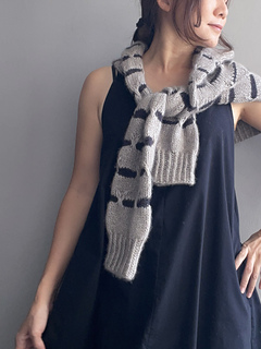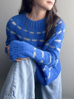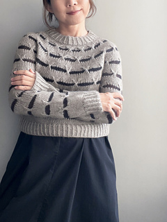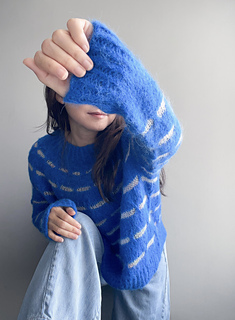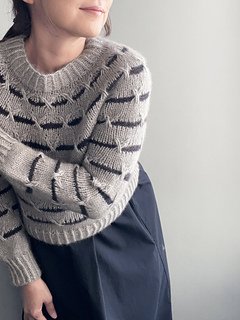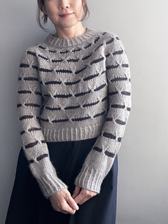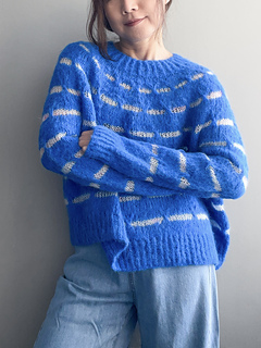 This sweater is knitted top down in the round. Short rows are used to shape the back. Increases are worked around the yoke with gradually widening stitch pattern repeats. The sweater has plenty of positive ease, fully featuring the light fluffiness of the yarn combination. The sheer stripes are knitted with two strands of lace weight yarn, while a single strand of the main yarn layers long crossed stitches rhythmically over parts of the stripes.