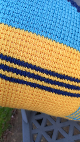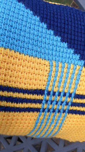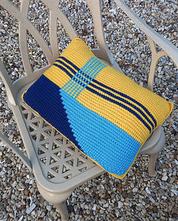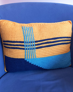 Balancing rhythm with bold contrast, this rectangular cushion cover is worked as two identical panels of Tunisian crochet, stitched neatly around a cushion pad. The first half of each panel features a golden field, broken by crisp horizontal and vertical stripes in Turquoise and French Navy. From there, the gold gives way to a striking diagonal divide, with French Navy on one side and Turquoise on the other. Made in King Cole Merino Blend DK, the design highlights the graphic lines and rich texture that Tunisian crochet brings to modern home décor. Pattern is written in English and uses UK terms.
