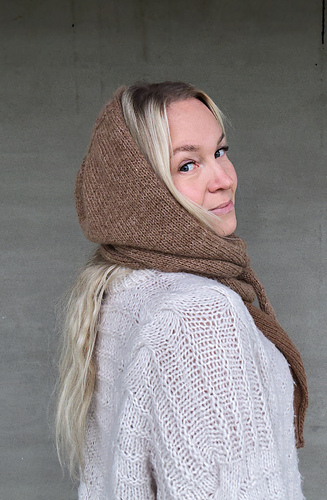 Crown Hood Scarf -huppuhuivin pehmoisen neulehupun päälakea koristaa näyttävä, mutta helppo palmikkokuvio, joka jatkuu aina niskaan saakka. Muuten huppuhuivi on elegantin simppeli ja sen reunat viimeistellään i-cordilla samalla kun huppua neulotaan ylhäältä alas. Tämä ihana asuste neulotaan aloittaen päälaen palmikosta, josta työtä jatketaan tasona ensin niskaan ja sitten huiviosaan, joka muotoillaan kavennuksin.