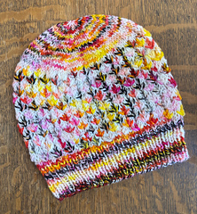 This hat uses stranded colorwork in a stitch pattern that showcases variegated yarns. Choose a contrast colour that makes your Main Color pop. The shape of the decorative stitch is reminiscent of crow’s feet!
