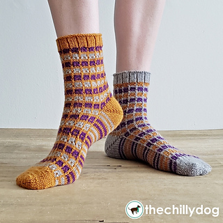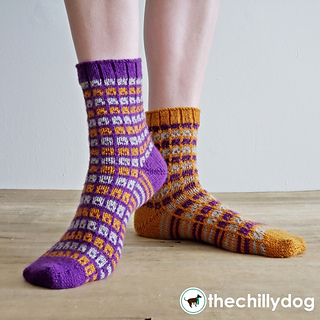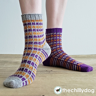 The socks feature a boxy, mosaic (slipped stitch) design. If you are new to mosaic colorwork, it is basically like knitting stripes with a few strategically placed slipped stitches. You are only working with one color of yarn at a time. The mosaic motif is charted.