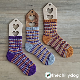 This pattern is a playful experiment in color theory. The trio of coordinating “mismatched” socks is created by rearranging the order of three contrasting colors when you knit each sock.
