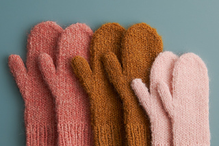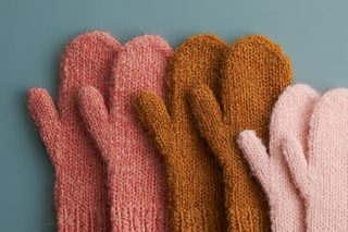 SAMPLES: The Peony Pink mittens are the Toddler/Kid size, and the Pink Bisque and Cork Tree mittens are the Adult Small size.