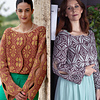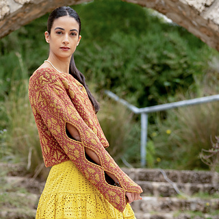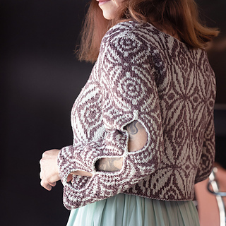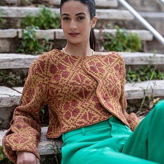 This double-sided jacket is worked bottom-up in one piece up to the underarms, then fronts and back are worked separately to shoulders. Left front edge is straight; right front edge is shaped to follow the shape of the pattern.