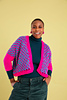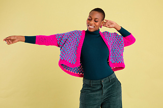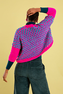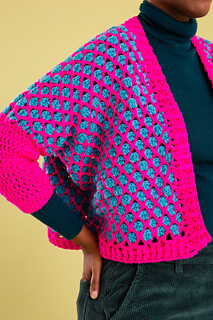 This colourful, chunky-weight shrug features colourwork in V-st and bobbles to create a trellis effect. Made with two contrasting colours which really pop, this is the perfect cosy layer to brighten up a January day.