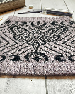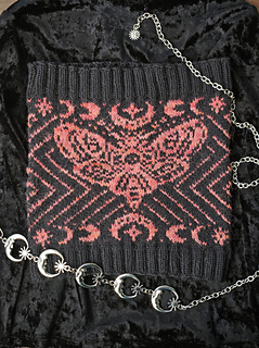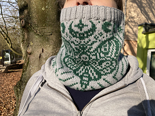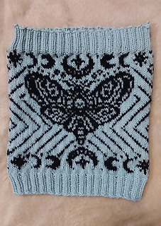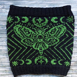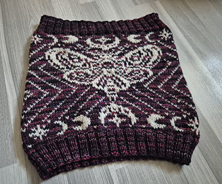 Cowl with death head hawk moth motif (known from the movie silence of the lambs) knitted in the round. You begin with a ribbed cuff. Then knit the mysterious death head hawk moth pattern in fairisle technique with two contrasting colours.
