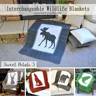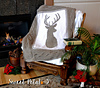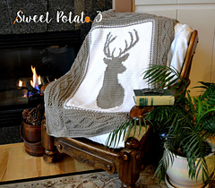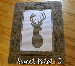 The blanket has a very detailed frame that features twisting cables and a striking diamond pattern. The corner pieces have a touch of whimsical charm in the circle pattern that also features textured raised cables. The richness in the frame of the blanket is perfectly paired with a striking white mat and a perfectly placed silhouette of a deer.