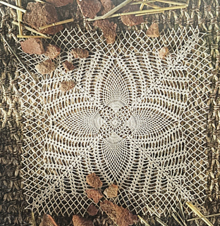 Square doily consisting of 4 pineapples, treble crochet and picot stitches for a total of 30 rounds.