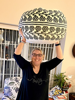 Knit entirely in the round this is a super fun pouf, ottoman, footstool, whatever you’d like to call it! The colorwork is slip stitch mosaic style so it is much easier than it looks, you’re only ever working with one color at a time.