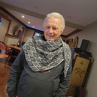 It’s a sideways-knit, shallow triangular shawl that can be also worn as a scarf, worked entirely in easy intuitive mosaic, gradually increasing to reach the desired width, then decreasing. Modification instructions for smaller/larger shawl are included.