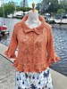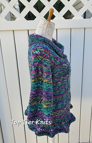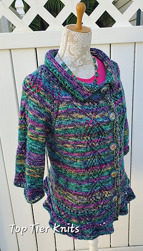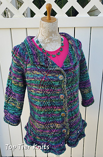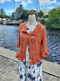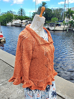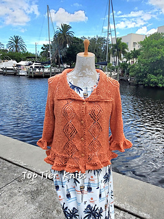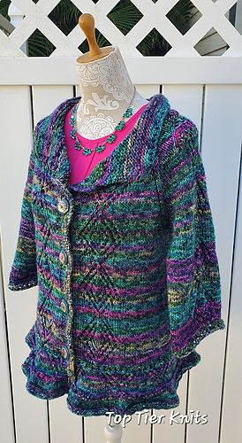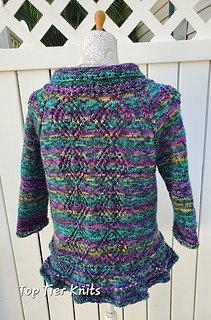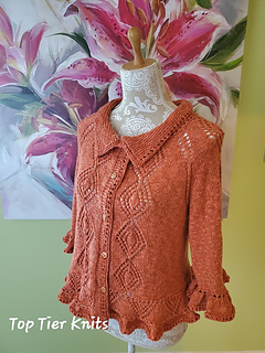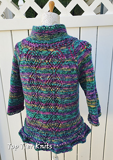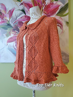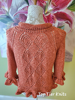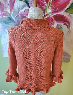 The pattern is fully written out; and includes a chart and schematic for sizes S, M and L It is designed for worsted weight yarn, but as depicted can be worked in DK or Aran weight yarn also - allowing for the difference in the gauge to ensure correct sizing. Because this cardigan is worked from the top down, you can try it on and make adjustments as you work. I chose to make the two examples shown with 4 diamonds in length. I recommend worsted weight or lighter as it is difficult to work the ruffles in Aran weight as they tend to curl back on themselves.