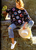 The lower body and cuff edge of this pulover are worked in a twisted rib pattern. There is no neck finishing. The sweater employs 1 Main colour (MC) and 12 Contrast colours (C1 – C21). Although a cream colourway is mentioned and pictured, together with a man’s version using different motifs and a traditional fisherman’s jersey shape, the yarn details are not provided for any of these stylings.
