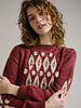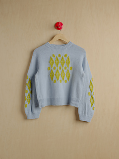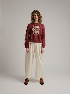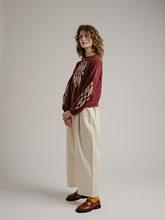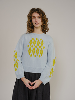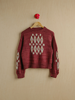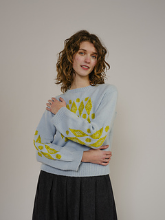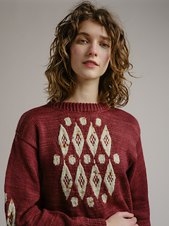 This sweater begins with a provisional cast on / tubular cast on and is knit in panels from the bottom up. The colorwork is achieved by following a colorwork chart. The sleeves are also worked in panels. The shoulders, side seams, and under sleeves are joined with crochet seams and the piece is finished with a folded rib at the neckline.