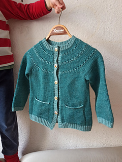 Dimi is a cute cardigan for children, both for girls and boys! It is knitted seamlessly from the top down. After the collar, three series of textured stitches add nice details that can be personalized according to your choice of more or less contrasting colors. The pattern provides directions for optional afterthought pockets with indications of variations. At the end the stitches for the button bands are picked up and knitted. Dimi is very fun to knit and will appeal kids of all age!