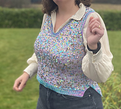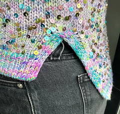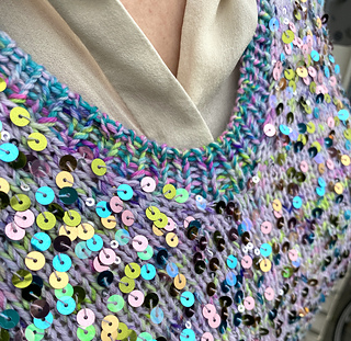 The slipover is knit with 1 strand of sock yarn held together with 1 strand of paillette/sequin yarn. The edges are knit with sock yarn held double.