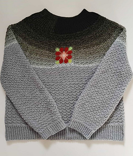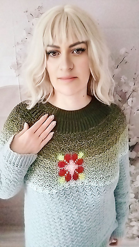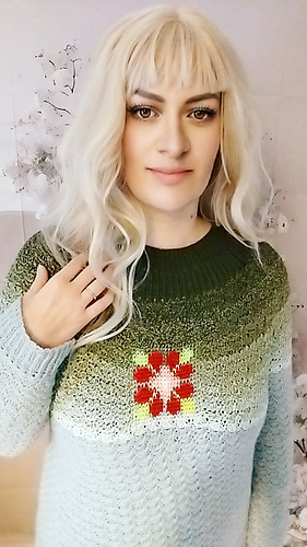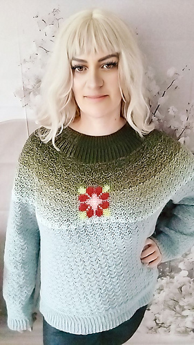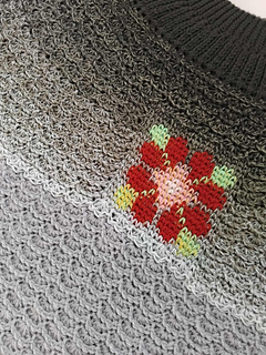 I used my 3 favorite ribbings, my favorite shell stitch with my favorite yarn together with a lovely floral mosaic. I am very satisfied with how this turned out and looking forward to applying the same recipe to create more beautiful, feminine garments.