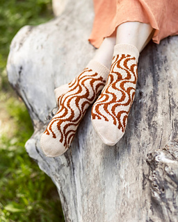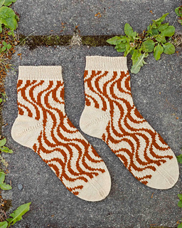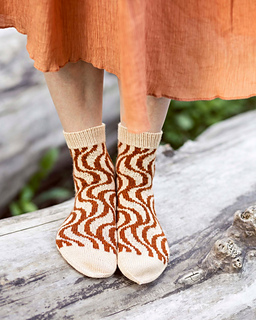Sarianna Lehtosen suunnittelemissa Dorrit-sukissa tasaraidat ja aaltokuvio yhdistyvät svengaaviksi pystyraidoiksi. Nilkkapituiset sukat neulotaan varresta varpaisiin ohuella langalla, ja niihin tehdään tiimalasikantapää.