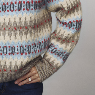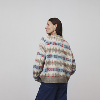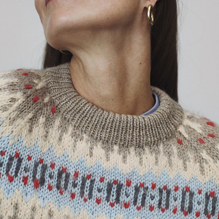 The Dorthea Sweater is worked in the round from the bottom up in stranded knitting according to a chart. Body and sleeves are worked separately until the armholes where they are then joined, The yoke is worked according to 2 charts with 4 panels bordered by the raglan decreases.