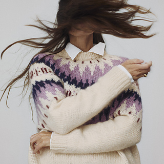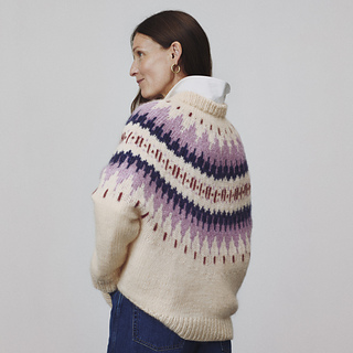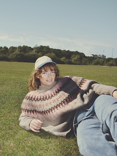 The Dorthea Yoke Sweater is worked in the round, top-down. After the ribbing, short rows are worked to shape the neckline, then the yoke is worked in stranded colorwork following the chart. You will then divide the body and work short rows on the body to even out the yoke’s curve at the sides. The body and sleeves are worked in the round in plain stockinette stitch, and each finished with a ribbed edge. The sweater has a relaxed fit with deep armholes.