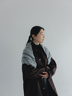 ふっくら滑らかな毛糸エアリーウールアルパカで長辺の中央から広げるように模様編みで編み始めます。ボッブルの部分はかぎ針に持ち替えて編みます。水玉模様の部分は小さなポンポンがついたドットヤーンを引き添えて編み、2本の筋のように伸びるラインはエアリーウールアルパカの別色に替えて編みます。