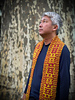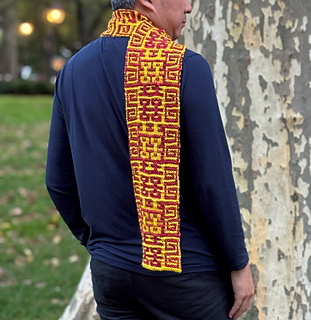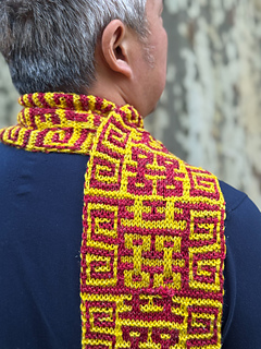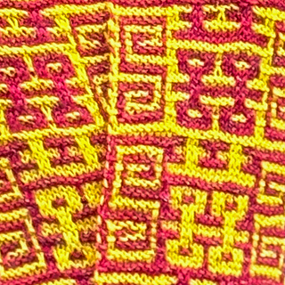 This is a Mosaic scarf using a Chinese double happiness motif “囍 (shuāngxǐ)” in the auspicious colors of red and gold.