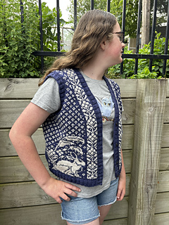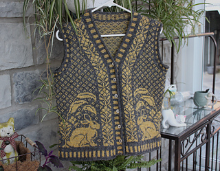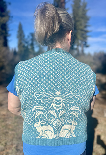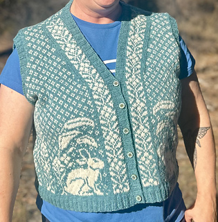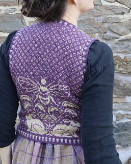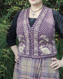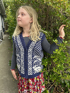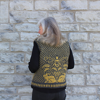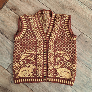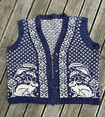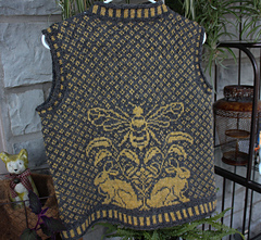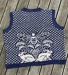 This is a pattern for a stranded work waistcoat worked in the round, from the bottom up, and with steeks. You may use corrugated or single-colour rib.