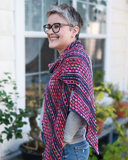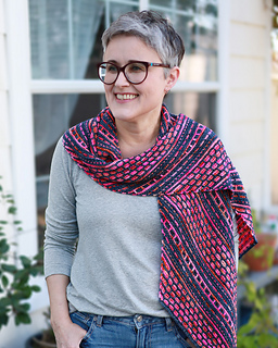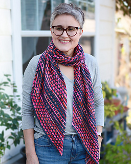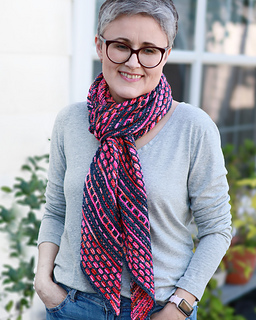The scarf is worked sideways on the bias to create a rectangular shape. The pattern is written to use most of two skeins of yarn, but both width and length are easy to adjust by working more or fewer repeats (additional yarn will be required for a larger size). The pattern includes both written instructions and charts.