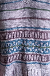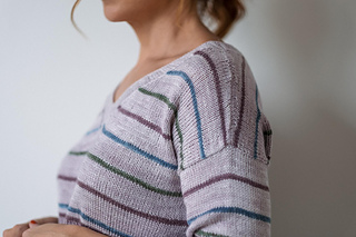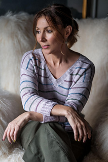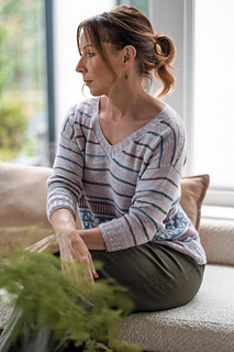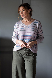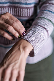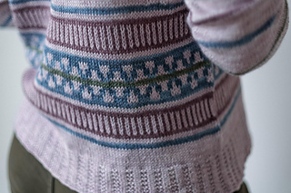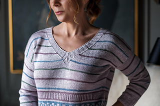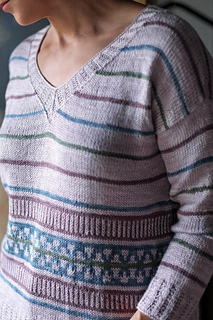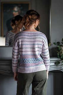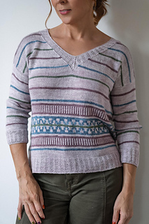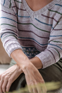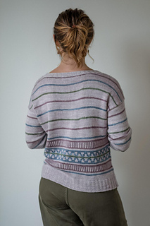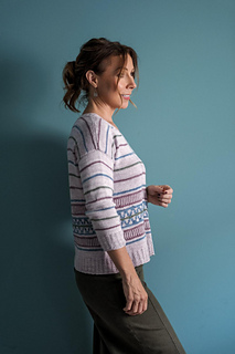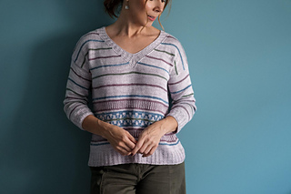 This fun top is the perfect spring or autumn pullover. Just the right weight for those days that are a bit cool and so easy to wear. This top starts with a 2 x 2 broken rib and then goes into a colorwork band that’s followed by lots of easy, peasy stripes. The sweater is separated for the front and back and then joined again with a three-needle bind off. The sleeves are picked up and worked down in the round, and then the neck band is picked up for that final touch.