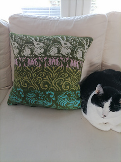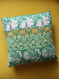 The pillow is knitted in one piece with the top and bottom closed by kitchener stitch or sewn seams. It is worked in stranded knitting with two colors per row.