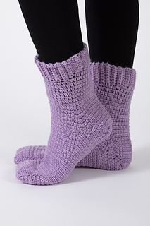 These socks begin with a SC Blp ribbing worked in turned rows. The ribbing strip is slip stitched to form a tube, then stitches are worked into the row ends to begin ankle. Ankle is worked top-down in the round in stretchy, smooth ESC. Increases shape the gusset, and stitches are skipped to create a heel opening (heel is added later). Decreases are made, instep is worked, and decreases shape toe. Heel is worked after toe is finished, however, if desired length of sock is uncertain, heel can be worked before finishing toe to determine fit/length of sock.