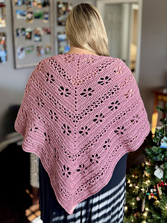 A pretty and feminine triangular crochet shawl with on-trend 70’s flower motifs and lace lattice work. The design works up surprisingly quickly, using simple stitches over a 10-row repeat. This shawl looks lovely worn teamed with a pretty, feminine dress, or worn over a plain jumper with jeans or long skirt.