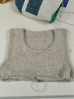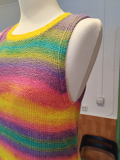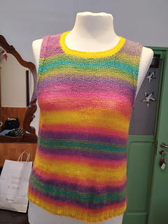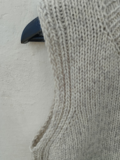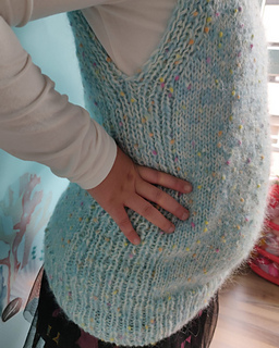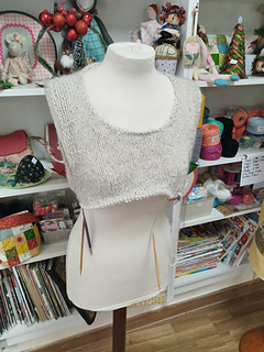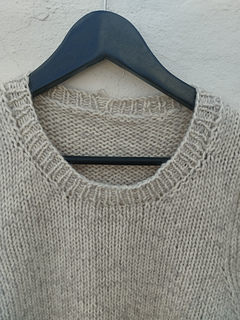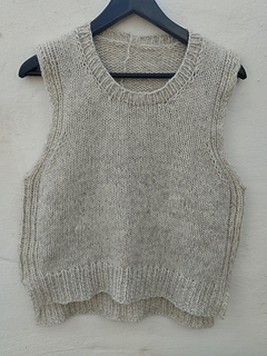 Esta prenda se teje completa usando dos hebras de hilo a la vez, una de cada calidad. Se teje en plano y sin costuras empezando desde arriba, Primero se teje la espalda hasta la sisa. Trabajaríamos el delantero de forma similar hasta el mismo punto. Unirías ambas piezas para seguir tejiendo en círculo hasta alcanzar el largo deseado y terminarías tejiendo el elástico del bajo. Por último, levantarás puntos para tejer el cuello.