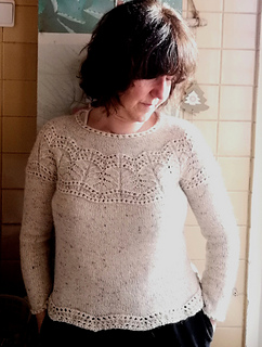 This sweater is knitted from the top down, in the round, seamlessly. We begin by knitting the yoke with increases and the lace pattern. In the armholes, the sleeve stitches are left on hold while you knit the body in the round. In the end, we pick up the hold stitches for the sleeves and knit down to the cuff. The lace pattern is described in both chart and written instructions.