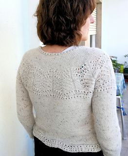 Este jersey está tejido de arriba hacia abajo en circular y sin costuras. Empezamos tejiendo el canesú con aumentos y el punto calado. En las sisas se dejan en espera los puntos de las mangas mientras se teje el cuerpo en circular. Al final, retomamos los puntos de las mangas y tejemos en circular hasta el puño. El patrón de punto calado se describe en un gráfico y en instrucciones escritas.