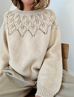 The leaf-patterned yoke is fun to knit and provides a great fit, because the combination of knit and purl stitches is so elastic. Ella Sweater is worked from the top down, and the neckline is shaped using short rows.