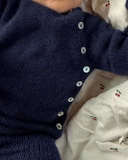 The top is a wrap-style jacket, worked back and forth top-down. It is closed with buttons along the left side. The button bands consist of 5 sts of rib and are worked in one piece with the jacket, so you do not have to pick up sts at the end.