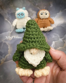This 3 in 1 design includes Bigfoot, the Yeti, and the barefooted Forest Gnome, each one measuring just 3”-4” tall, when worked in worsted weight yarn!