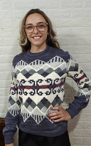 The sweater features geometric colourwork and is worked completely in the round thanks to the seamless top-down construction and European shoulder. Because some of the floats are quite long in places, I recommend using the Ladderback Jacquard method to keep the inside of your work neat and tidy. This was actually my first time experimenting with working three colours at once, but using Ladderback Jacquard makes the process much less intimidating.