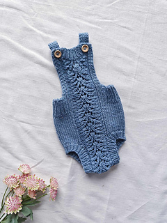 Romperen strikkes ovenfra og ned, først frem og tilbake, så rundt, så fem og tilbake igjen. det plukkes opp masker til benkanter, kant til knappehull for bleieskift og til seler.