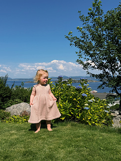 Etter inspirasjon fra Engelina knytekjole har vi laget en lignende kjole til større barn. Kjolen har et vidt skjørt som smalnes inn ved overgangen til bærestykket som er mer fasongnært. Kjolen har brede stropper over skuldrene.