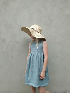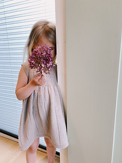 Etter inspirasjon fra Engelina knytekjole har vi også laget en lignende kjole til større barn. Kjolen har et vidt skjørt som smalnes inn ved overgangen til bærestykket som er mer fasongnært. Kjolen har brede stropper over skuldrene.